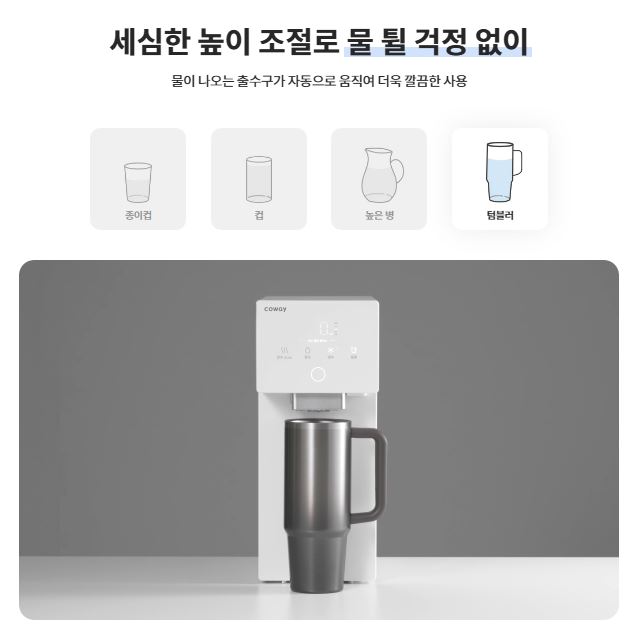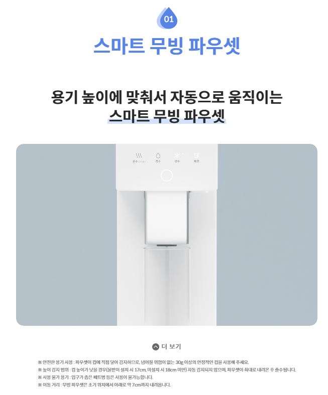 물컵 용기에 맞춰서 절대로 물이 튀지 않는 스마트한 무빙 기능!